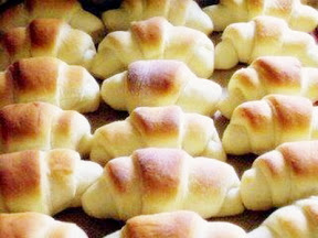I usually separate the dough into just two bundles and roll out into a circle, smear with softened margarine and cut into pie shapes and roll up starting with wide end first, putting the rolled ones, tip side down on greased baking sheets. Let rise 45-60 minutes, covered.