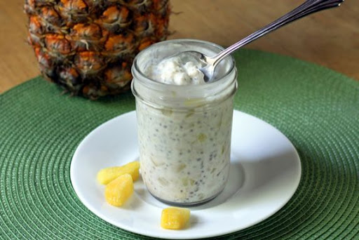 In a half pint (1 cup) jar, add oats, coconut milk, yogurt, chia seeds, and honey. Put lid on jar and shake until well combined. Remove lid, add pineapple and stir until mixed throughout. Return lid to jar and refrigerate overnight or up to 3 days. Eat chilled or warm in the microwave.