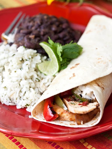 Fill your tortilla warmer with flour tortillas. Microwave covered for 1 minute and let sit covered. Fill center with marinated meat then a layer of roasted bell peppers or corn and black bean salsa. Squeeze lime juice on top and close. Serve with lime cilantro rice and a sour cream side and salsa side.