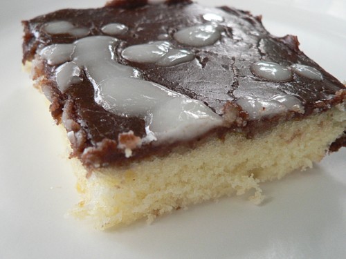 While cake is baking, make the icing. Chop pecans finely. Melt butter in a saucepan. Add cocoa, stir to combine, then turn off heat. Add the milk, vanilla, and powdered sugar. Stir together. Add the pecans, stir together, and pour over warm cake.