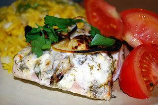 Whisk together mayonnaise, feta, herbs, and lemon juice and spread over top of fish.