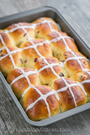 Once buns are just warm (not hot), stir together the ½ cup powdered sugar and about 2½ tsp milk. You can add more powdered sugar to thicken it up if needed. Transfer glaze to a ziploc bag, cut off the tip of the bag and pipe a cross shape over each of the buns. Serve warm or at room temperature.