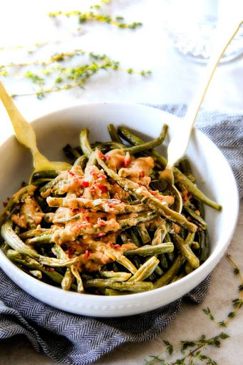 Roasted Green Beans with Creamy Gruyere Sauce and Bacon