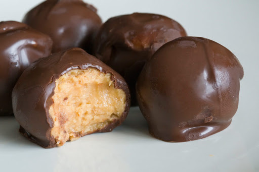 Melt semisweet chocolate working quickly drop balls into chocolate and roll into peanuts. Place on cookie sheet and freeze until cooled. Store in an airtight container in freezer.