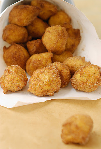 Using a small ice-cream scooper or 2 small spoons, carefully drop about a tablespoon of the dough into the hot olive oil, frying in batches. The zeppole will immediately float to the top and puff up. Turn the zeppole once or twice with the size of a slotted spoon, cooking until golden and puffed up, about 5 minutes (watch constantly as cooking time might also be quite a bit shorter). Drain on paper towels. Toss with cinnamon-sugar. Arrange on a platter (or in a cone) and serve immediately.