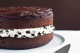 MEANWHILE, beat cream cheese and sugar in large bowl with mixer until blended. Gently stir in COOL WHIP and crushed cookies. Stack cake layers on plate, spreading cream cheese mixture between layers. Spread top with chocolate glaze; let stand until firm. Keep refrigerated.