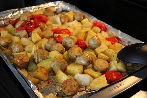 Cut potatoes in half or quarters (depending on size), and add to a large bowl. Toss with oil, the meat, rosemary, salt and pepper. Pour out onto a baking sheet in a single layer.