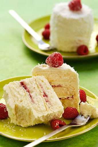 If you will be serving the cake the day it is made, cover each layer of buttercream with fresh berries – use whole raspberries, sliced or halved strawberries or whole blackberries, and match the preserves to the fruit. You can replace the coconut on top of the cake with a crown of berries, or use both coconut and berries. You can also replace the buttercream between the layers with fairly firmly whipped sweetened cream and then either frost the cake with buttercream (the contrast between the lighter whipped cream and the firmer buttercream is nice) or finish it with more whipped cream. If you use whipped cream, you’ll have to store the cake the in the refrigerator – let it sit for about 20 minutes at room temperature before serving.