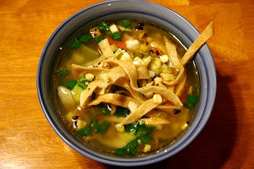 Combine broth, cumin, garlic, chili powder and tortillas in a large, heavy pot. Simmer for 30 minutes. Strain into another pot or used slotted spoon to remove all solids. Add chicken, tomato and onion; simmer 30 minutes. Note: soup can be made ahead to this point, then reheated within 48 hours. To serve, put soup in slow cooker to keep warm and surround with bowls of garnishes