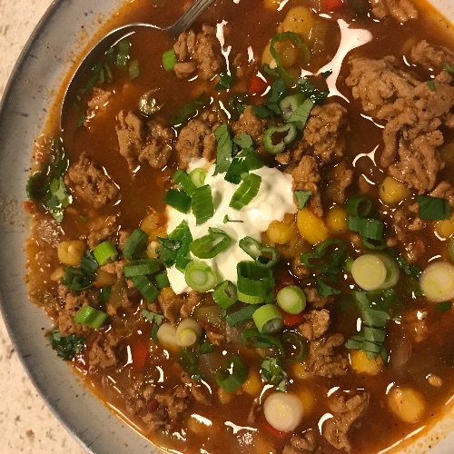 Taste and adjust the seasoning and serve, topped with cilantro, scallions , chopped jalapeños and sour cream.