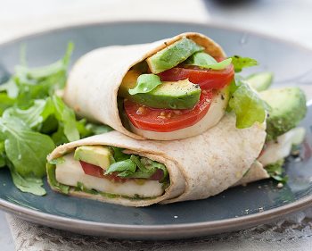 Starting at the bottom, roll each tortilla tightly tucking in the filling as you roll towards the top. Cut in half, seam side down, and serve.