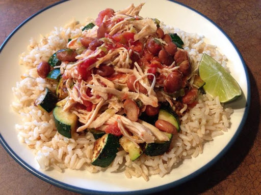 Cook on low for 10 hours or on high for 6 hours. Half hour before serving, remove chicken and shred. Return chicken to slow cooker and stir in. Adjust salt and seasoning to taste. Serve over brown rice or sprouted wheat tortillas and your favorite toppings.