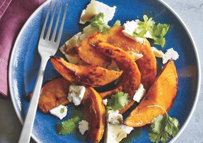 Layer pumpkin with 3 oz sliced feta and 1/4 cup cilantro leaves. Drizzle with pumpkin seed oil and sherry vinegar to taste.
