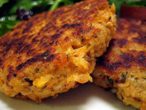 Open salmon and pour juice into measuring cup. Dump drained salmon into bowl. Add egg and mix. Add ½ cup flour and mix with fork. Take ¼ cup salmon juice and add baking powder. Beat with fork. This will foam. Pour into salmon mixture. This will be thin. Drop by spoonfuls into hot oil. Cook for 15 minutes.