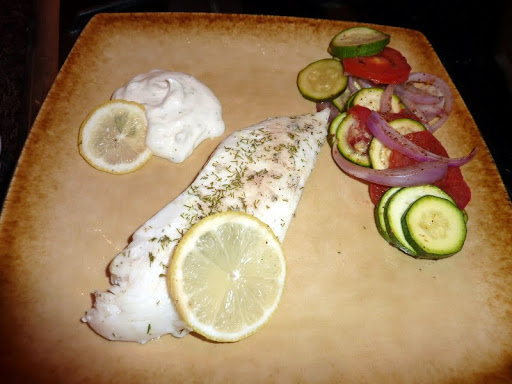 Place tilapia fillet (or other white fish) on a piece of foil sprayed with cooking spray. Season with juice and zest of a lemon, salt, pepper, dill, onion powder, garlic powder. Slice lemon pieces and place on top of the fish. Seal foil to keep steam inside.