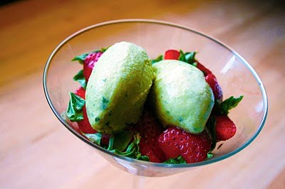 3. Use either an ice cream scoop or spoon dipped in hot water to quenelle the basil ice cream on top of the strawberries in the glass. Serve immediately.