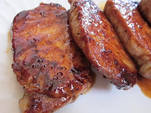 5. Remove the chops from the oven and drag each side around in the thick glaze that has formed around the chops in the pan prior to serving.
