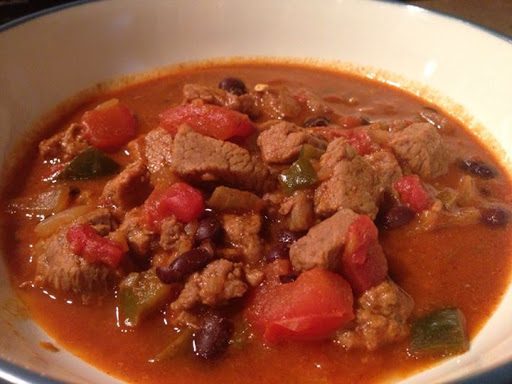 In large pot, brown beef & onions together until cooked. Add poblano peppers and tomatoes along with taco seasoning and beef broth. Bring to boil and add canned tomatoes/green chilies, tomato sauce & black beans.