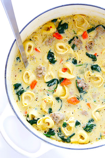 Stir in the cooked sausage, tortellini, spinach, and milk, and continue simmering for 4-5 minutes, or until the tortellini is al dente.