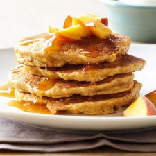 Heat oven to 325 degrees Grease an 11′ springform pan with butter on the bottom and sides and sprinkle lightly with sugar Place fresh ricotta, diced peach, cinnamon and honey in a food processor and puree until creamy Beat egg whites in a stand mixer with whisk attachment on low until foamy. Add ½ of the sugar and gradually raise speed to high whisking until egg whites become stiff, white and glossy (about 3-4 mins). Meanwhile, whisk together ricotta, peach and honey mixture with egg yolks, gluten-free flour, remaining sugar, lemon zest and salt in a large bowl. Fold ⅓ of the egg whites into the mixiture using a rubber spatula until just combined. Gently fold in the rest until just combined. Pour batter into pan and bake at 350 until top is deep golden brown (about 25 minutes). Reduce temperature to 225 and continue to bake until center is firm (about an additional 35-40 minutes). Let stand for 20 minutes. Run a knife around the edge of the cake, release the sides and cool in the refrigerator at least 4 hours or overnight. Garnish with sliced peaches and drizzle honey all over the top of the cake.