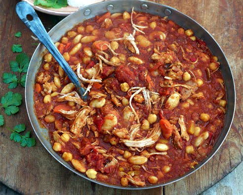 While that’s happening, shred the turkey meat off your carcass and roughly chop it. Add a good pinch of salt and pepper to the pan of vegetables, then add the turkey and take the pan off the heat. Add the tomatoes and chickpeas or butter beans and stir everything together. Pop it in the hot oven to blip away for 2 hours. Check on it after an hour, and add a splash of water if it looks a bit dry.