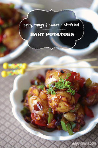 Start with boiling the potatoes in salted water. Once done strain and prick them a couple of times all over with a toothpick or kebab stick. This will help the flavours seep in. In a wok or non stick frying pan, heat the oil and add the ginger garlic. Fry till fragrant and add the peppers. Further fry for about 30 seconds and then toss in the potatoes. Fry them till a little crispy and coloured. Now add the sauces and seasoning, and giving them a good stir, making sure all the potatoes are coated well. Taste them to make any adjustments if you have to. Add the corriander and serve warm with toothpicks to pick them.