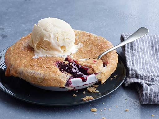 Position a rack in the lower third of the oven and preheat to 375 degrees F. Top each dish with a piece of dough, pressing the edge against the dish to seal; pierce several times with a knife. Bake 45 minutes, then brush each pie with heavy cream and sprinkle with sugar. Continue baking until golden, about 15 more minutes. Serve with ice cream.
