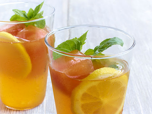 Stir 1 cup of the sugar syrup, the lemon juice, 5 cups cold water and the vodka into the chilled tea, then add the tea ice cubes. Pour into glasses; serve with lemon slices and mint leaves.