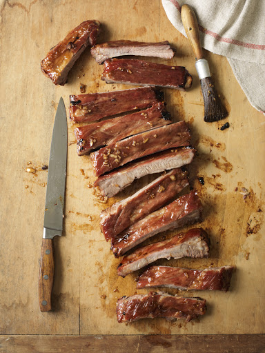 3. Lower the oven temperature to 350 degrees. Remove the ribs from the rack and arrange in a baking pan; brush them with the sauce. Bake uncovered for 45 to 60 minutes, basting frequently, until the ribs are glazed to a deep mahogany color.