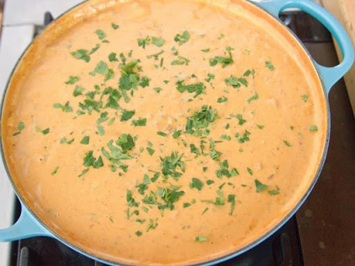 Pour the diced tomatoes and green chiles into the food processor and pulse slightly. Add to the pot, juice and all. Fold in the reserved diced chiles. Cook for 4 minutes. Slowly whisk in both cheeses and the evaporated milk. Cook for an additional 5 minutes to heat through, making sure to not scorch the bottom of the pot. Garnish with the chopped cilantro and eat from the pot with tortilla chips.
