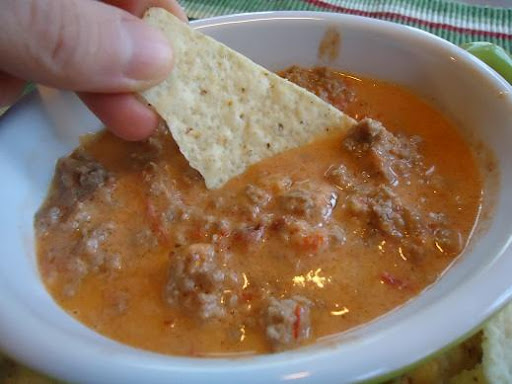 Brown beef and drain well. Melt cheese and add salsa. Combine meat and cheese mixture. Serve hot with tortilla chips.