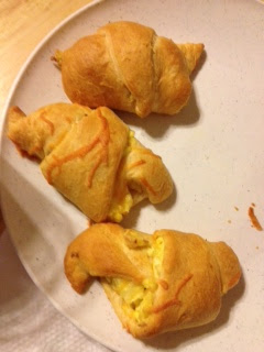 Top each triangle with bacon, scrambled egg and cheese. Roll up loosely as directed on can. Place on ungreased cookie sheet; curve into crescent shape. Brush with beaten egg; sprinkle with pepper.