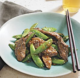 Heat 1-1/2 Tbs. oil in a large (12-inch) skillet or wok over medium-high heat until shimmering. Add the beef and cook, stirring occasionally, until it loses its raw color and browns in places, about 2 to 3 minutes. Transfer to a large plate. Cook the ginger with the remaining 1-1/2 Tbs. oil until it sizzles steadily and starts to brown lightly around the edges, about 1 minute. Add the snap peas, sprinkle with 1/4 tsp. salt, and cook, stirring, until they turn bright green and start to brown in places, 1 to 2 minutes. Add 1/3 cup water and cook, stirring, until about half of the liquid cooks off and the peas start to soften, about 1 minute. Add the soy sauce mixture and beef, and cook, stirring, for a couple minutes until the mixture heats through and coats the peas and beef. Whisk the cornstarch with 1/4 cup water; add to the beef, and cook, stirring, until the sauce thickens, about 1 minute. Sprinkle with the remaining tsp. sesame seeds, and serve.