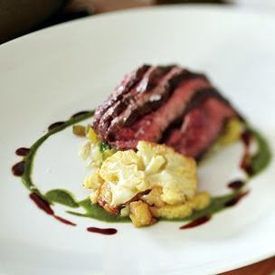 To serve, spoon the arugula puree onto the center of individual plates, dividing evenly; using the back of the spoon, form the puree into a large circle. Gently spoon the polenta into the center of the arugula puree. Top the polenta with slices of steak, arrange the melted leeks and cauliflower around the plate, and finish with a drizzle of the red wine-infused demi-glace. Serve immediately. Serves 6 to 8.