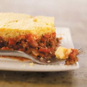 Transfer to an 11-in. x 7-in. baking dish coated with cooking spray. For topping, in a small bowl, combine the flour, cornmeal, sugar, baking powder and salt. Combine the egg, milk and oil; stir into dry ingredients just until moistened. Spoon over filling; gently spread to cover the top.