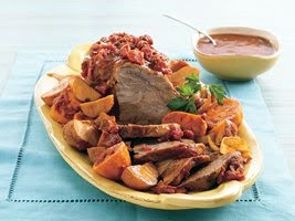 Remove netting from pork. Rub oil over pork; roll in spices in bowl to cover. Place pork over vegetables. Pour tomato sauce, tomatoes and chopped chile over pork and vegetables.