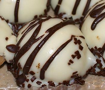 Simultaneously, pipe a stripe design of chocolate ganache over the dome.