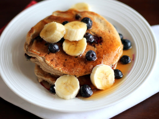 Lightly coat a large nonstick skillet or griddle with butter or cooking spray and heat over medium low heat. Drop batter by 1/4 cup onto skillet. Add desired toppings such as chocolate chips or blueberries. Cook until bubbles appear on top. Flip cakes and cook until golden brown on underside. Wipe skillet clean and repeat with more cooking spray and remaining batter. Makes 3-4 pancakes.