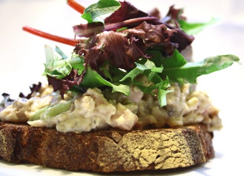 In a small bowl, mix mustard, olive oil, vinegar, sugar and dill weed. Toss with greens. Plate greens and top with avocado chicken mixture