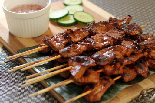 6. Using a barbecue grill or charcoal grill place pork skewers and cook until it is lightly charred on one side, turn on the other side and baste with the marinade. Repeat this process until pork barbecue is cooked.