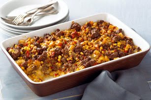 STIR in taco mix and water. Add potatoes, corn and VELVEETA; mix well. Spoon into 13x9-inch baking dish; cover.