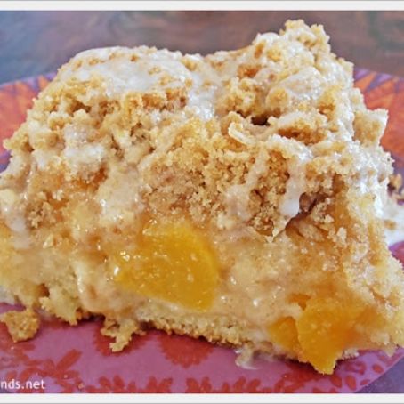 This coffee cake has a few layers to enjoy. A base of coffee cake, a layer of peaches, more cake, then a streusel topping and a basic powdered sugar glaze tops it off. If you wanted to go over the top you could serve it with vanilla ice cream but I thought it was just perfect as is. Enjoy!