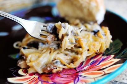 Add mushrooms, chicken, and chopped olives. Stir to combine and check seasonings. Add cooked spaghetti and stir.