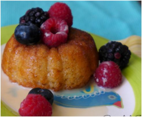 With a small fork or toothpick, poke holes in each bundt cake and brush butter rum sauce over cakes. To serve, drizzle remaining sauce over cakes and garnish with fresh berries.