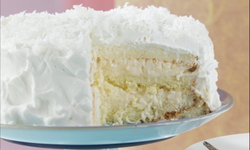 •When cake is completely cooled, cut into three layers using a serrated knife. Place one layer on a 9-inch cake board or a serving plate. Place half the pastry cream on top and spread to edge evenly. Place second layer of cake on top of pastry cream and spread remaining pastry cream on top. Place third layer of cake on top. Frost top and sides of cake with remaining whipped cream and sprinkle with 1/2 cup coconut.