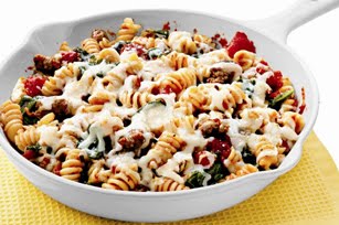 DRAIN pasta; return to pan. Add sausage mixture and cheeses; mix lightly.