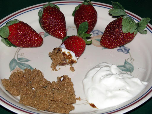 To eat, dip the strawberry first into the sour cream, then into the brown sugar.