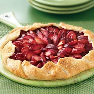 Roll pastry into a 12-in. circle. Transfer to a large baking sheet lined with parchment paper. In a large bowl, combine plums, 3 tablespoons sugar and cornstarch. Arrange plums in a pinwheel pattern over pastry to within 2 in. of edges; sprinkle with ginger. Fold edges of pastry over plums.