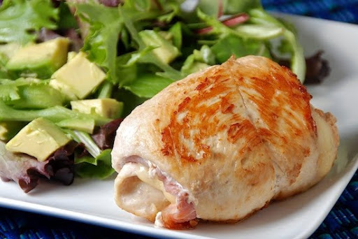 Dip chicken breast in milk, then in butter, eggs and fine crumbs. Roll ham and cheese together. Place inside chicken breast. Fold chicken breast over and shape in oblong bundle. Store in refrigerator 6 hours.
