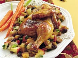 2.Split each game hen in half. Sprinkle lightly with salt and pepper. Place hen halves, skin side up, over stuffing. In 1-quart saucepan, melt jelly with 2 tablespoons butter over low heat; brush over hens.